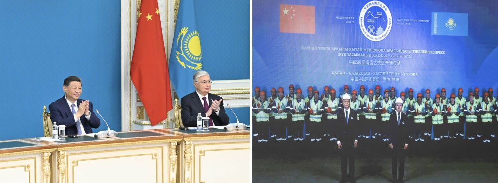 中午,習(xí)近平同托卡耶夫在阿斯塔納總統(tǒng)府以視頻方式共同出席中歐跨里海直達(dá)快運(yùn)開通儀式。哈方項目負(fù)責(zé)人向兩國元首匯報準(zhǔn)備情況,中方項目負(fù)責(zé)人請兩國元首下達(dá)指令。兩國元首共同下達(dá)作業(yè)指令:“啟運(yùn)!”兩國元首通過大屏幕觀看車輛登船、集裝箱裝船等實時情況?,F(xiàn)場響起熱烈掌聲。