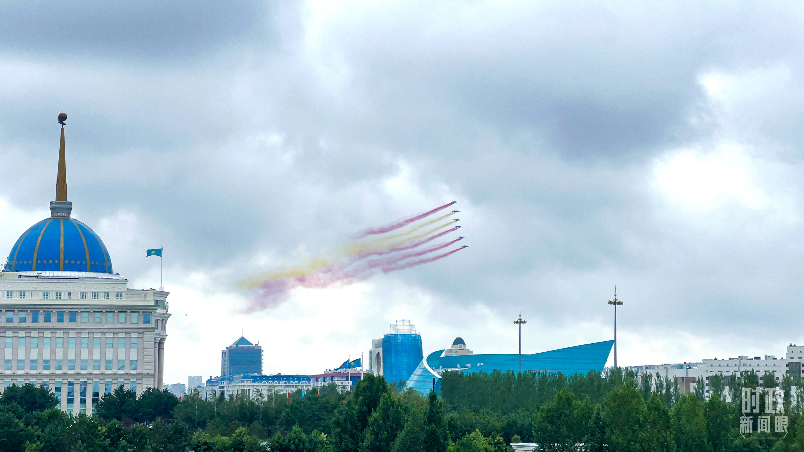 習(xí)主席乘車抵達(dá)哈總統(tǒng)府時(shí),托卡耶夫總統(tǒng)熱情迎接。六架哈薩克斯坦空軍戰(zhàn)機(jī)從總統(tǒng)府上空飛過,拉出象征中國(guó)國(guó)旗色彩的紅黃色彩煙,以最高禮儀歡迎中國(guó)貴賓。