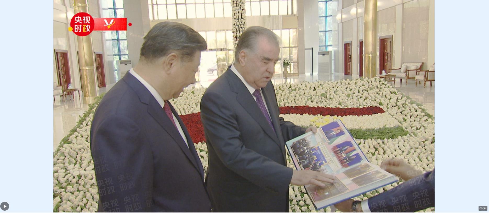 在機(jī)場,拉赫蒙向習(xí)近平贈送2014年以來三次訪塔的珍貴相冊,再次熱烈祝賀習(xí)近平主席對塔吉克斯坦成功進(jìn)行歷史性國事訪問。