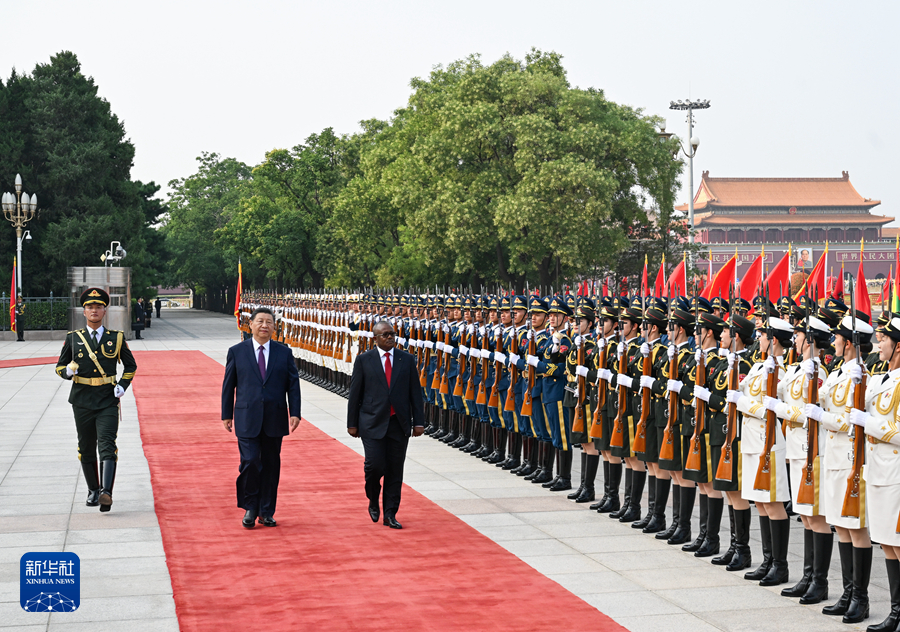 恩巴洛抵達時,禮兵列隊致敬。兩國元首登上檢閱臺,軍樂團奏中國和幾內(nèi)亞比紹兩國國歌,天安門廣場鳴放21響禮炮。恩巴洛在習近平陪同下檢閱中國人民解放軍儀仗隊,并觀看分列式。