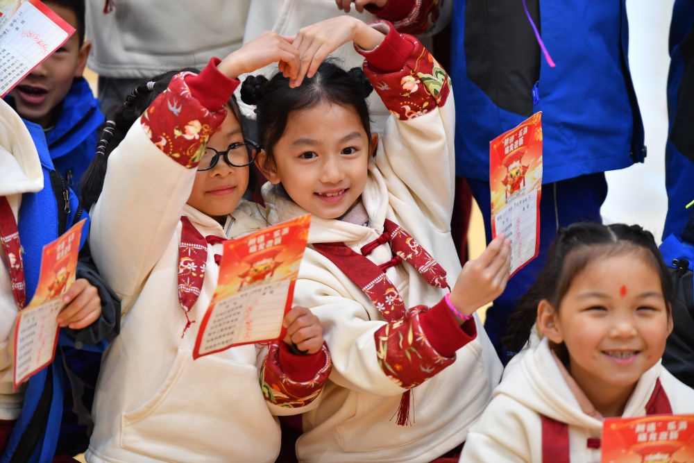 在湖南省長沙市天心區(qū)的湖南師大附中雙語實(shí)驗(yàn)學(xué)校,一年級(jí)學(xué)生在趣味闖關(guān)活動(dòng)中展示自己的闖關(guān)卡片(2024年1月18日攝)。新華社記者 陳澤國 攝