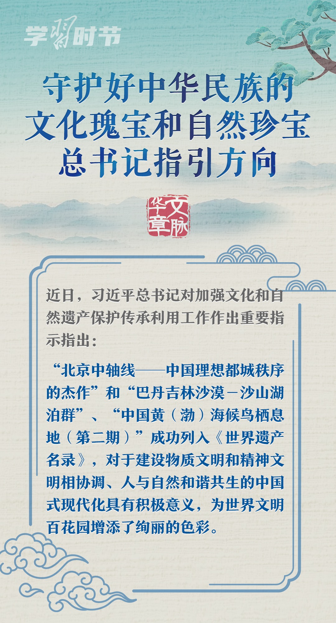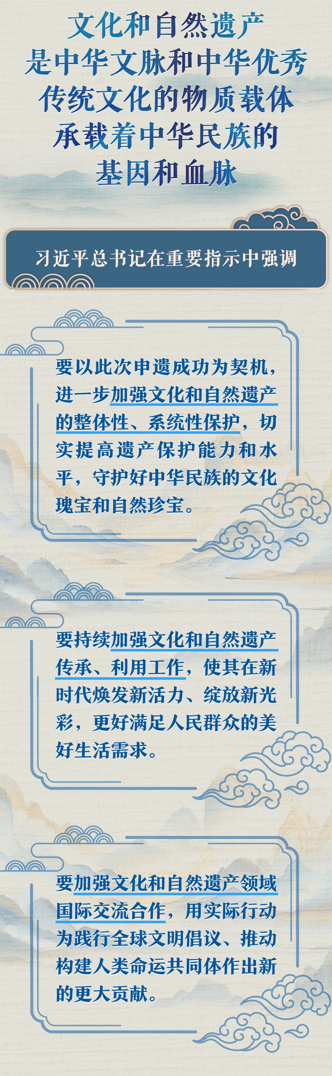 文化遺產(chǎn)體現(xiàn)了中華民族旺盛的生命力和創(chuàng)造力,自然遺產(chǎn)昭示了神奇的自然造化同中華民族的和諧依存關(guān)系。習(xí)近平總書(shū)記一直以來(lái)高度重視文化和自然遺產(chǎn)保護(hù)傳承利用工作,近日專(zhuān)門(mén)就此作出重要指示強(qiáng)調(diào),守護(hù)好中華民族的文化瑰寶和自然珍寶,讓文化和自然遺產(chǎn)在新時(shí)代煥發(fā)新活力綻放新光彩。讓我們一同學(xué)習(xí)。