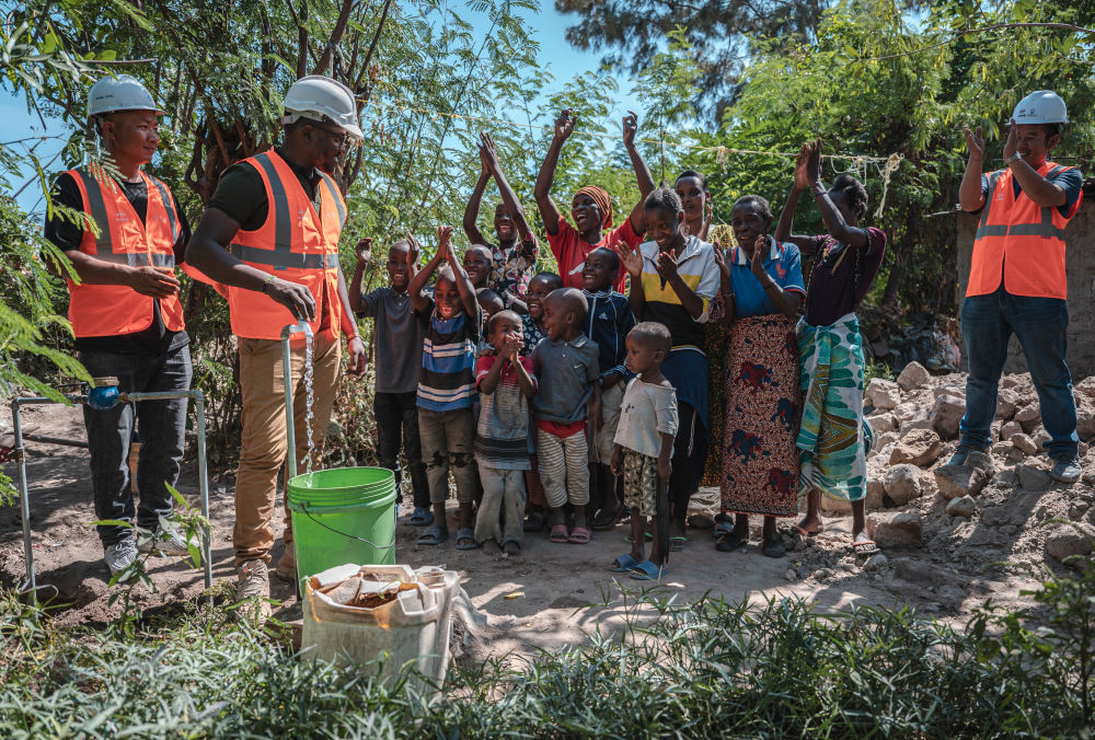 2023年6月13日,在坦桑尼亞姆萬扎省米松圭,工作人員接通水管后贏得當?shù)鼐用窆恼茪g呼。新華社記者 王冠森 攝