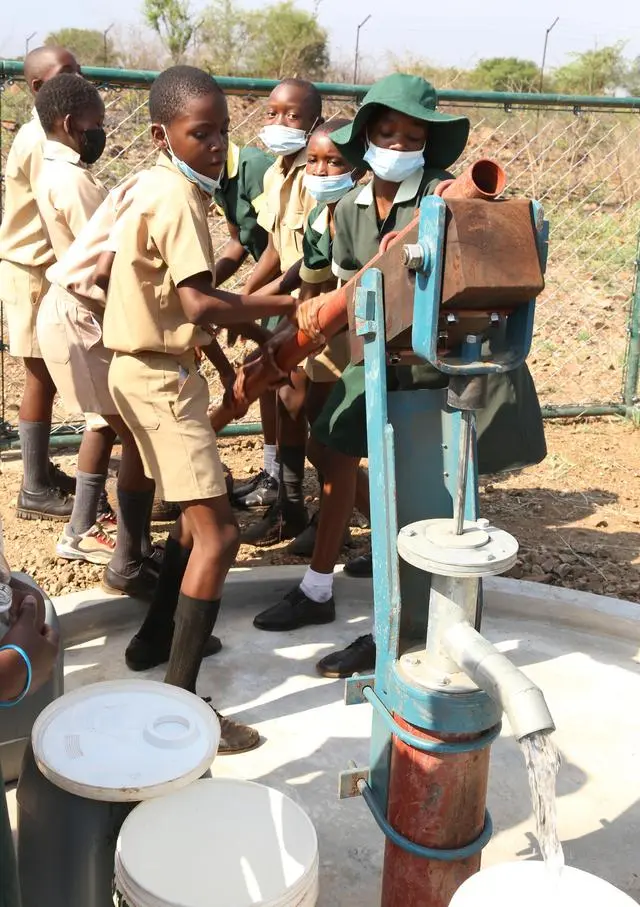 2021年11月,在津巴布韋南馬塔貝萊蘭省省會關(guān)達的塞農(nóng)多小學,學生從中國援建水井里打水。