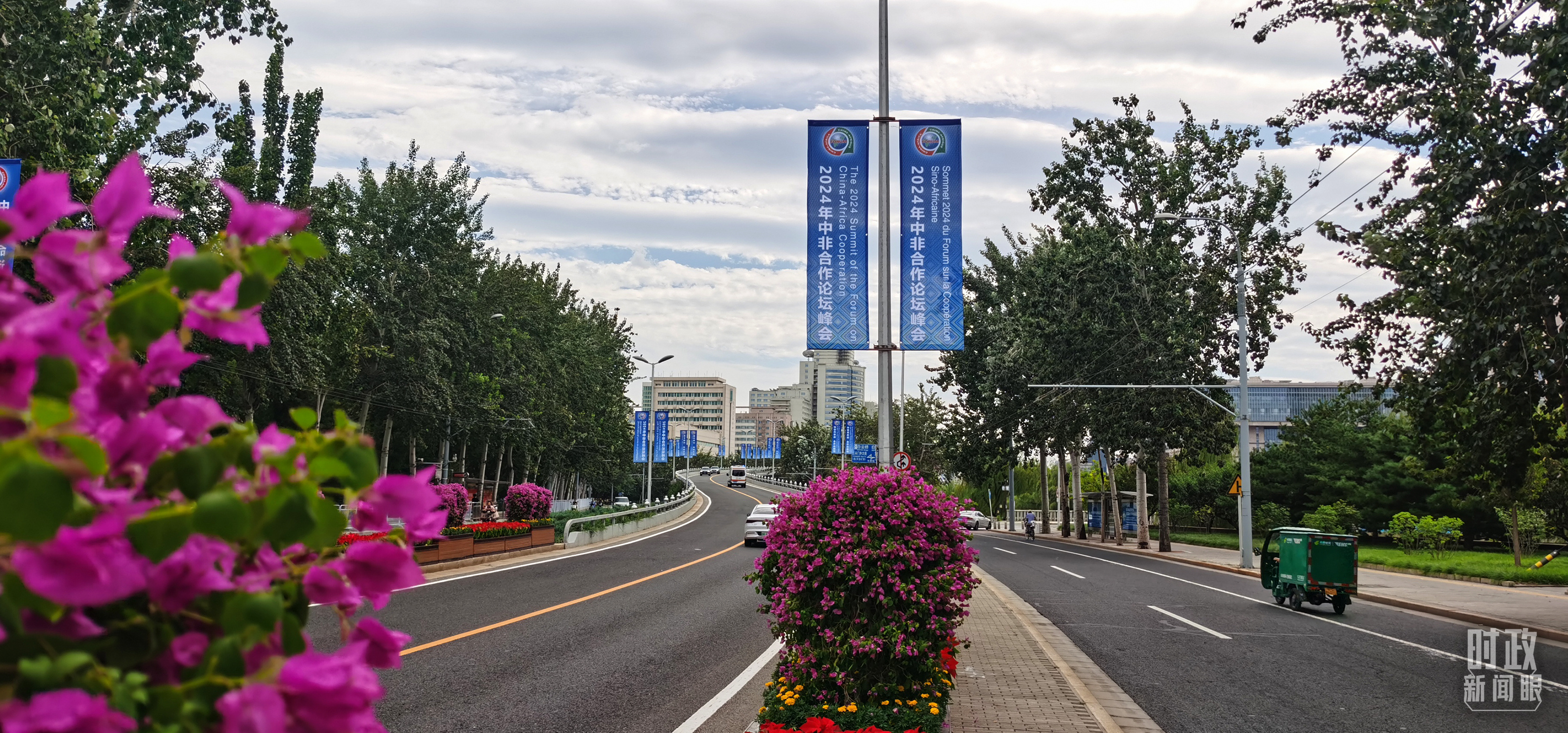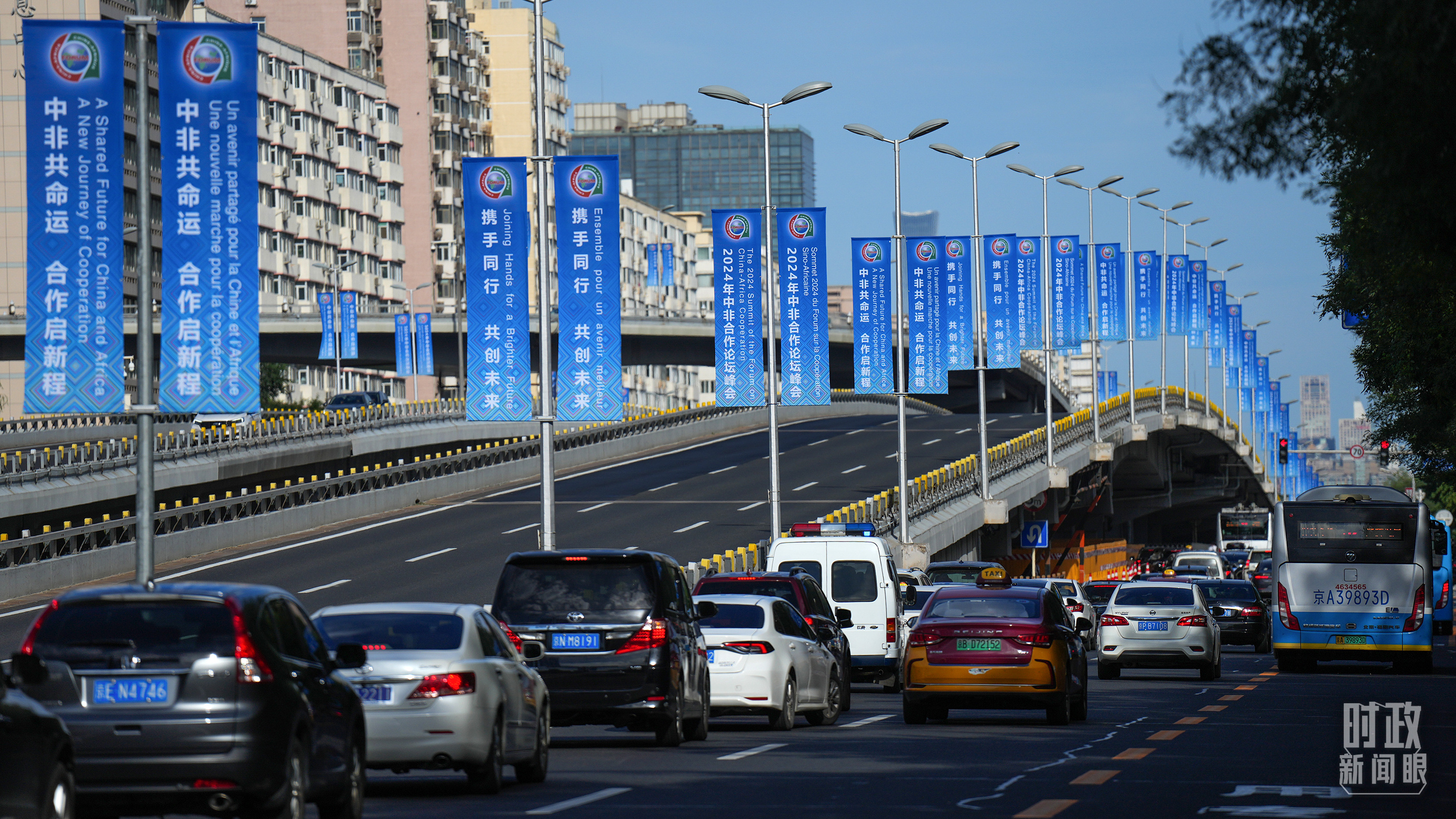 北京街頭懸掛的2024年中非合作論壇峰會旗幟。(總臺央視記者陳漢章拍攝)