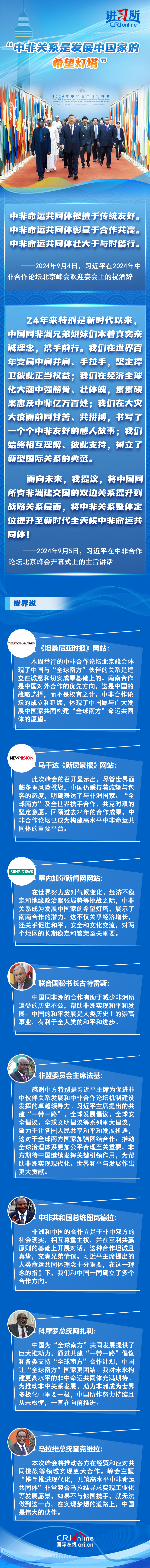 從宣布建立“新型伙伴關(guān)系”,到整體定位提升至“新時(shí)代全天候中非命運(yùn)共同體”,成立24年的中非合作論壇不斷推動(dòng)中非關(guān)系實(shí)現(xiàn)跨越式發(fā)展,特別是新時(shí)代以來(lái),中國(guó)本著真實(shí)親誠(chéng)理念,同非洲兄弟姐妹們攜手前行,受到非方廣泛稱贊。非方各界認(rèn)為,為推動(dòng)非中關(guān)系發(fā)展、助力非洲成為世界多極化中重要一極,中國(guó)所作努力持續(xù)且從未松懈,中非關(guān)系是發(fā)展中國(guó)家的希望燈塔。
