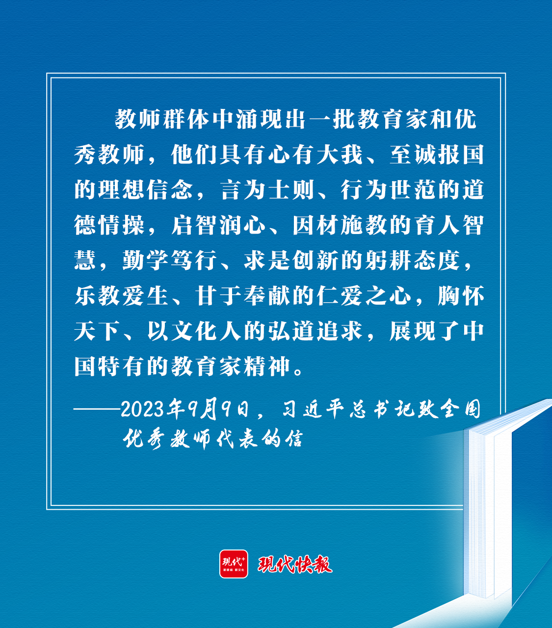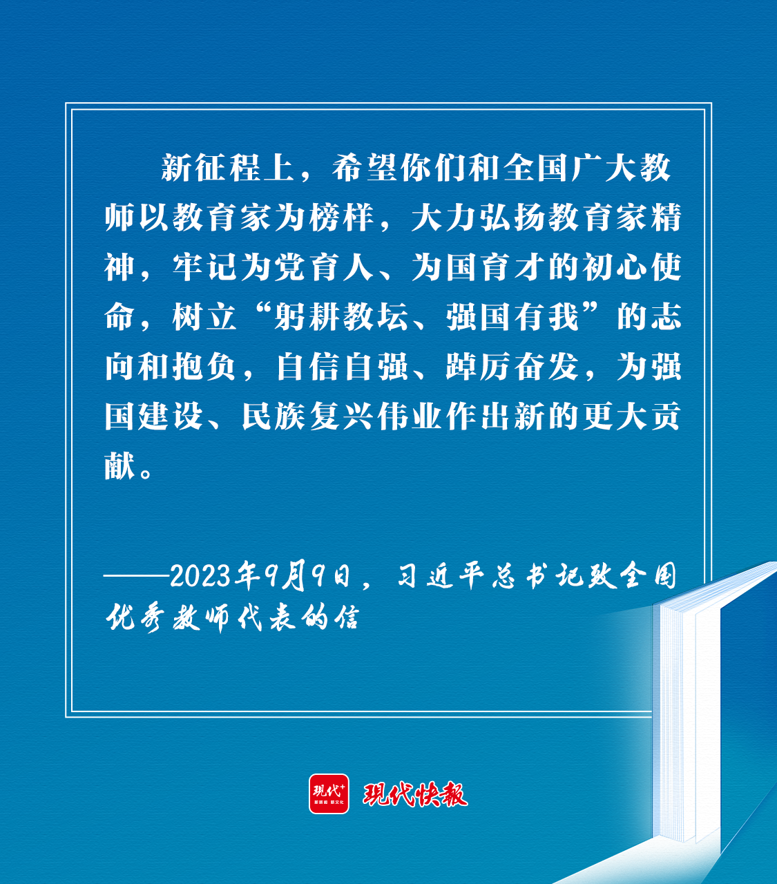 2023年9月9日,習近平總書記在致全國優(yōu)秀教師代表的信中強調:“新征程上,希望你們和全國廣大教師以教育家為榜樣,大力弘揚教育家精神,牢記為黨育人、為國育才的初心使命,樹立‘躬耕教壇、強國有我’的志向和抱負,自信自強、踔厲奮發(fā),為強國建設、民族復興偉業(yè)作出新的更大貢獻。”