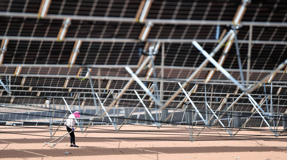 在甘肅省武威市涼州區(qū)九墩灘光伏治沙示范園區(qū),工人在光伏板下作業(yè)(2023 年 5 月 19 日攝) 陳斌攝 / 本刊