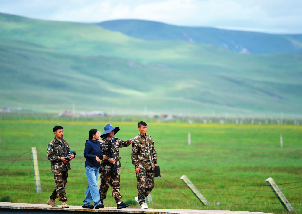 甘肅尕海則岔國家級(jí)自然保護(hù)區(qū)管護(hù)中心尕海保護(hù)站站長香毛吉 ( 左二)和同事在保護(hù)區(qū)內(nèi)巡護(hù)(2023 年 7 月 7 日攝)陳斌攝 / 本刊