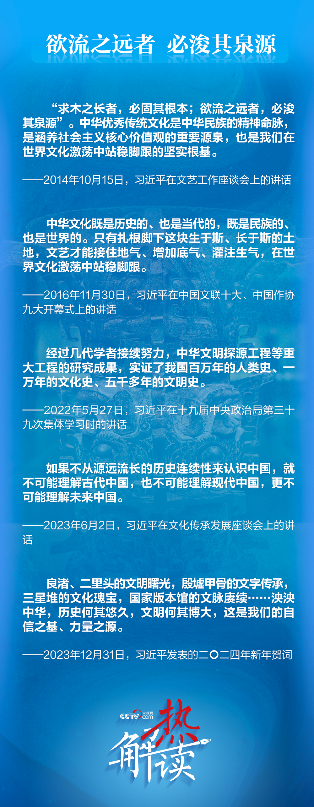 一件件文物、一處處文化古跡、一項項文化藝術(shù),串連起中華民族的文化史,蘊藏著“何以中國”的文化力量??倳泴χ腥A文明之源的關(guān)注,彰顯的正是他對推動文化繁榮、建設(shè)文化強國的深刻思考和文化自信。