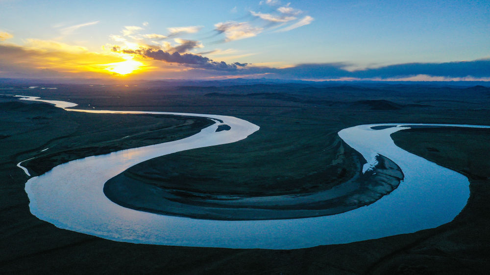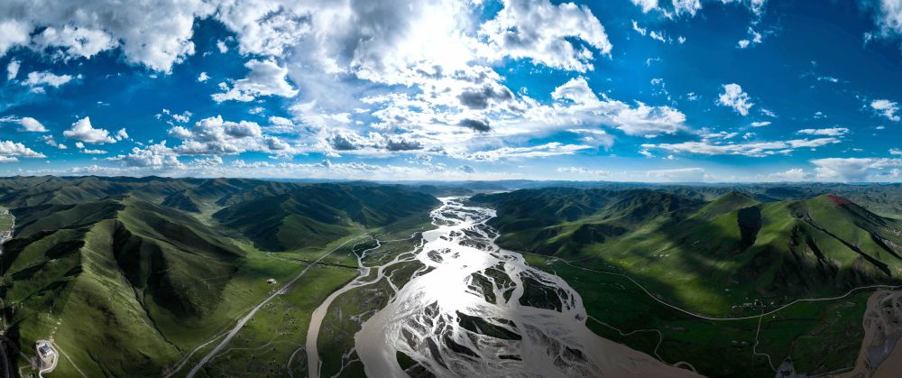 2024年7月31日在青海省果洛藏族自治州達(dá)日縣境內(nèi)拍攝的黃河(無(wú)人機(jī)全景照片)。