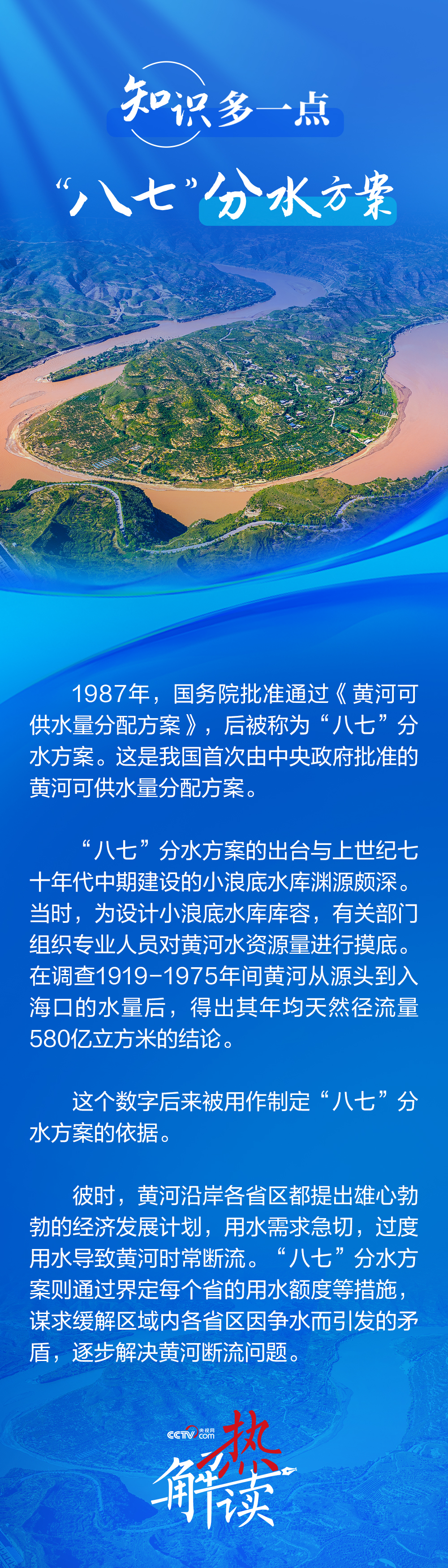 “八七”分水方案是上世紀(jì)八十年代我國批準(zhǔn)的黃河可供水量分配方案。該方案以1980年實際用水量為基準(zhǔn),綜合考慮了沿黃各省區(qū)的灌溉發(fā)展規(guī)模、工業(yè)和城市用水增長以及大中型水利工程興建等因素,來為沿黃各省區(qū)分配黃河用水權(quán)。“八七”分水方案自1987年國務(wù)院批復(fù)后沿用至今,未重新調(diào)整。