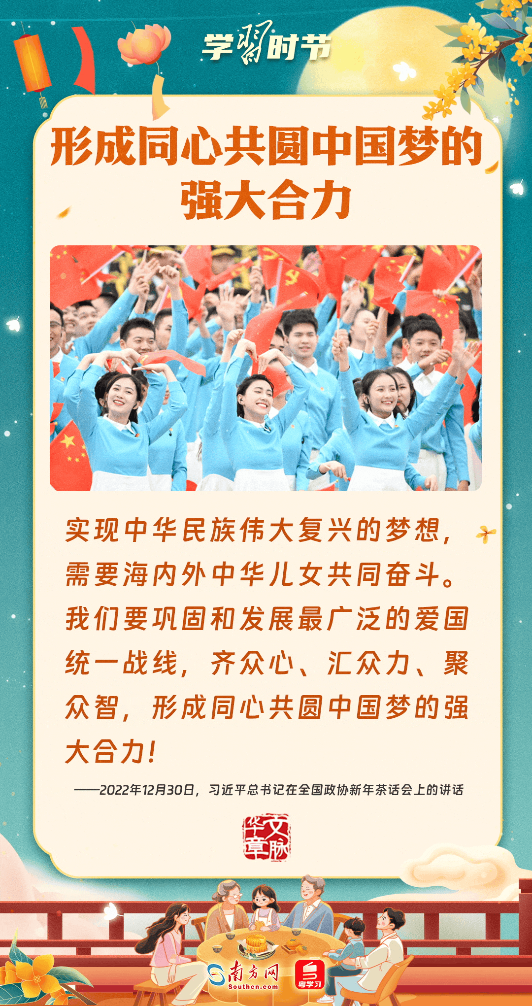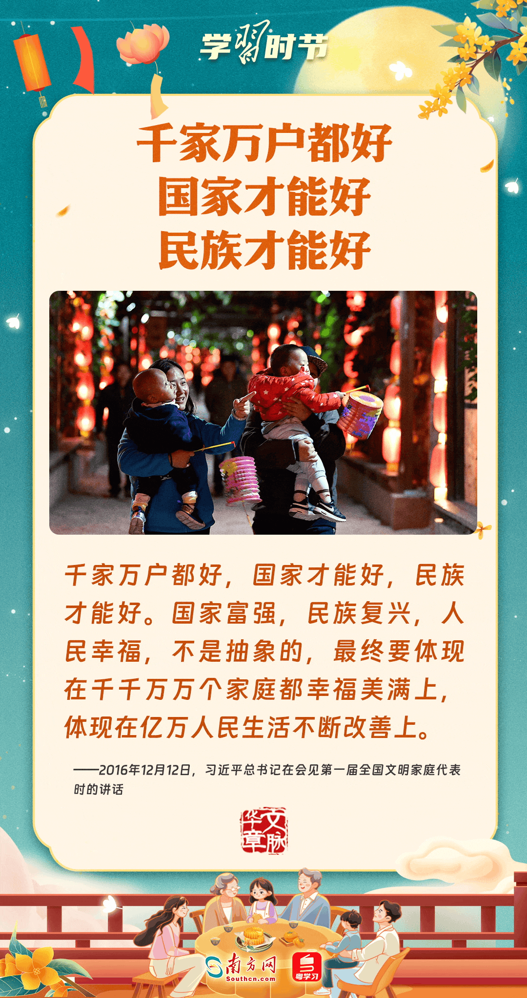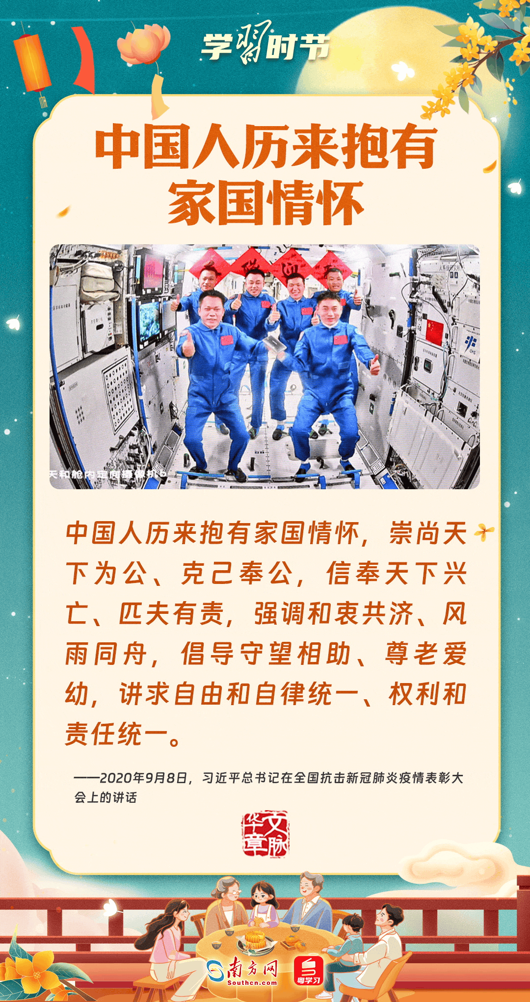 明月寄相思,家國總關(guān)情。作為中華優(yōu)秀傳統(tǒng)文化的重要載體之一,中秋節(jié)不但寄托著海內(nèi)外華人對(duì)闔家團(tuán)圓的美好期許,還承載著深厚的故鄉(xiāng)情、家國情。習(xí)近平總書記曾在多個(gè)場(chǎng)合深刻闡述個(gè)人、家庭與國家之間的關(guān)系,強(qiáng)調(diào)要厚植家國情懷,把實(shí)現(xiàn)個(gè)人夢(mèng)、家庭夢(mèng)融入國家夢(mèng)、民族夢(mèng)之中。中秋佳節(jié),讓我們一起回顧總書記那些經(jīng)典話語,共同感受他至深至厚的家國情懷。