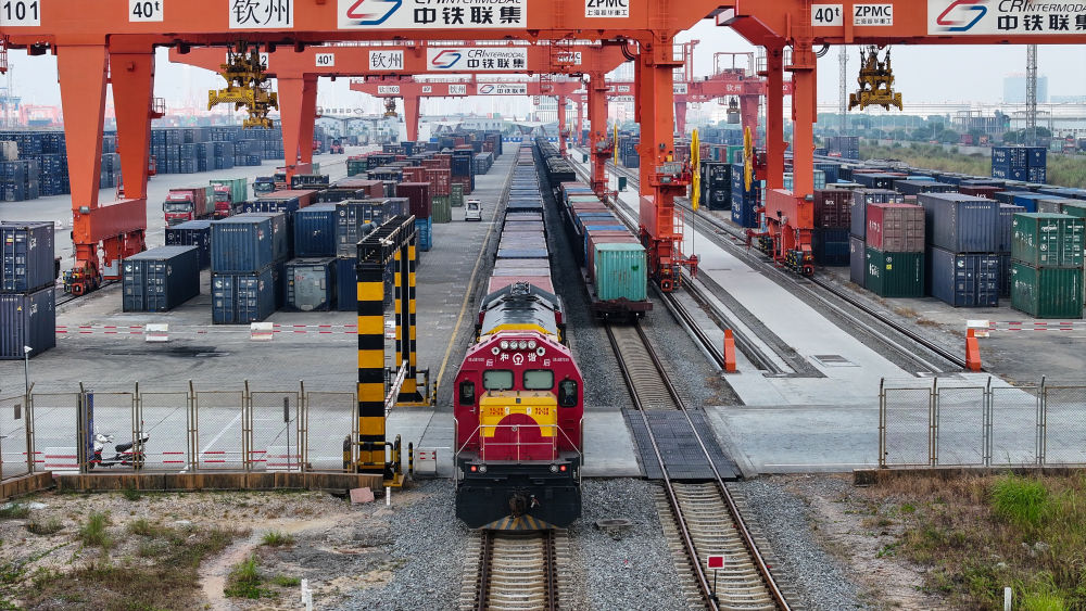西部陸海新通道鐵海聯(lián)運(yùn)班列從欽州港東站駛出(2024年5月12日攝,無人機(jī)照片)。隨著中國-東盟開放平臺建設(shè)向縱深推進(jìn),西部陸海新通道正在成為釋放開放活力的強(qiáng)力新引擎,以物流為切入口,促進(jìn)資金、資源、人員、技術(shù)等生產(chǎn)要素深度融合。