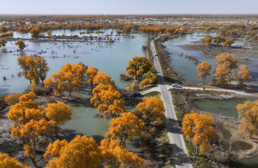 2023年11月4日拍攝的新疆尉犁縣羅布淖爾國家濕地公園(無人機照片)。新疆沿塔里木河流域分布著約1500萬畝胡楊林,是世界面積最大的胡楊林區(qū)。