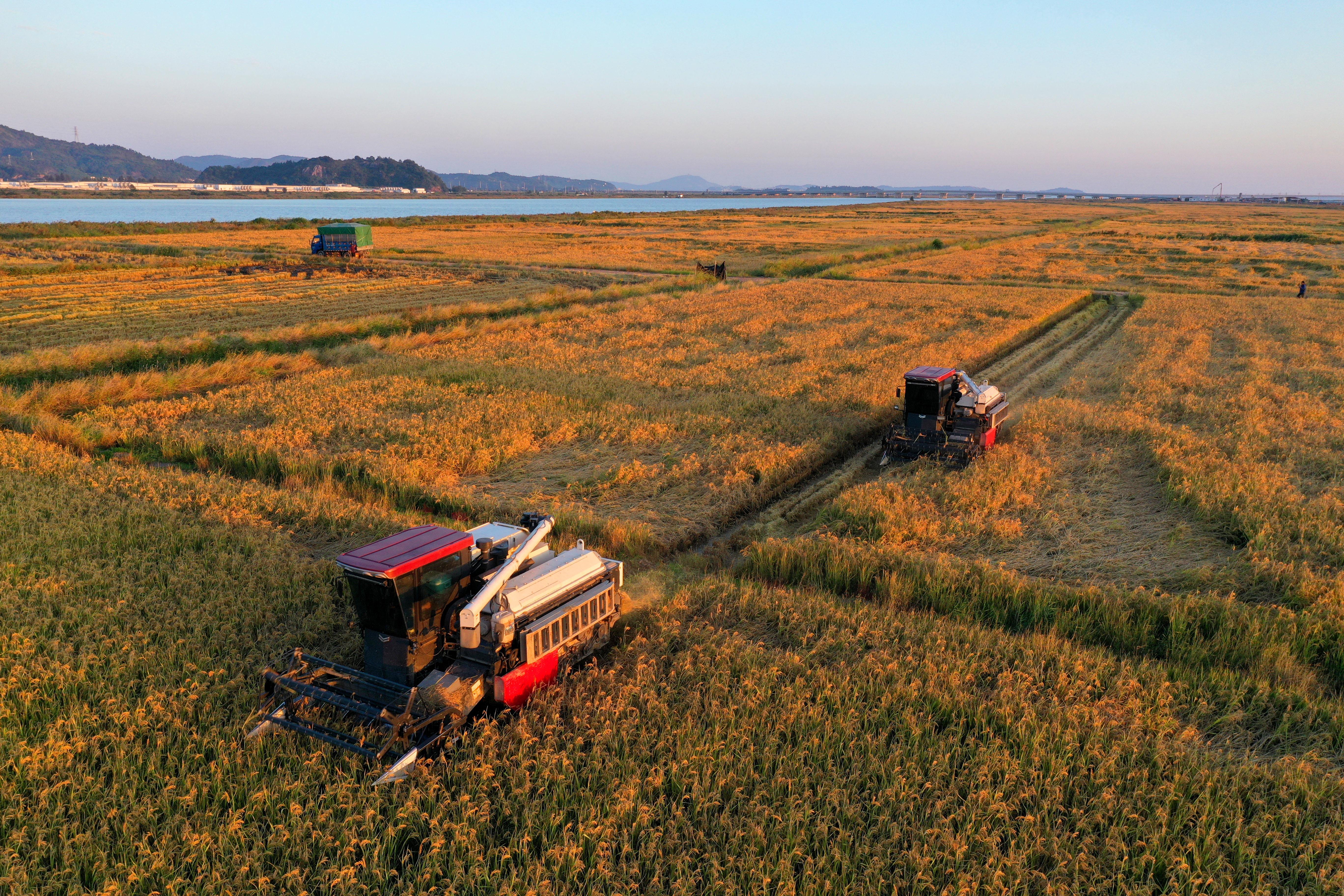 深秋時(shí)節(jié),浙江省玉環(huán)市漩門(mén)三期智慧農(nóng)業(yè)示范基地的海水稻迎來(lái)豐收,農(nóng)民駕駛收割機(jī)忙著收割。