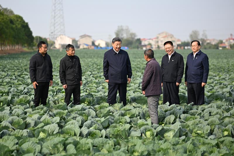 2024年11月5日,習(xí)近平總書(shū)記在湖北省咸寧市嘉魚(yú)縣潘家灣鎮(zhèn)十里蔬菜長(zhǎng)廊考察時(shí),同菜農(nóng)親切交流。