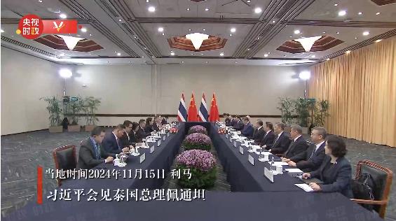 當?shù)貢r間11月15日,國家主席習近平在利馬出席亞太經(jīng)合組織領導人非正式會議期間會見泰國總理佩通坦。