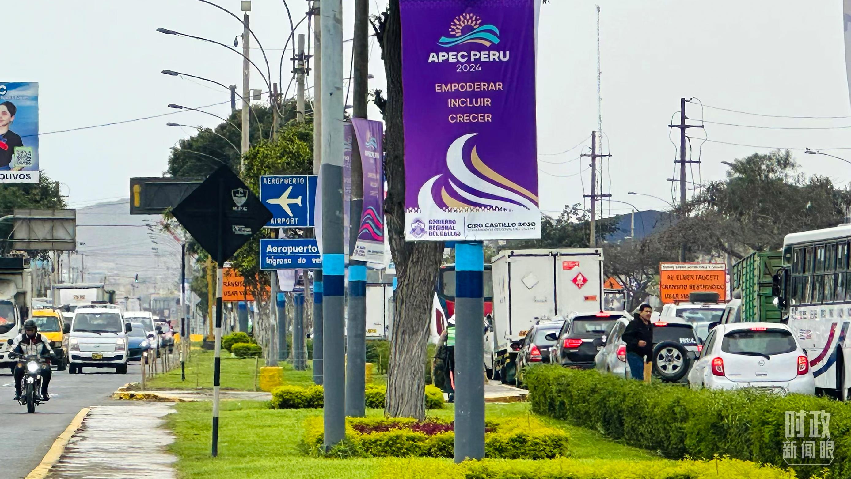 △利馬空軍基地懸掛的中國國旗和APEC會議標牌。(總臺央視記者鄂介甫拍攝)