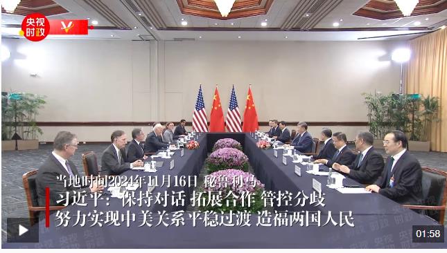 習(xí)近平指出,很高興再次同拜登總統(tǒng)先生見面。過去4年,中美關(guān)系雖然歷經(jīng)跌宕起伏,但在我們兩人領(lǐng)航把舵下,也開展了卓有成效的對話和合作,總體實(shí)現(xiàn)了穩(wěn)定。美國剛剛舉行了大選。中方致力于中美關(guān)系穩(wěn)定、健康、可持續(xù)發(fā)展的目標(biāo)沒有變,按照相互尊重、和平共處、合作共贏處理中美關(guān)系的原則沒有變,堅定維護(hù)自身主權(quán)、安全、發(fā)展利益的立場沒有變,賡續(xù)中美人民傳統(tǒng)友誼的愿望沒有變。中方愿同美國政府繼續(xù)保持對話、拓展合作、管控分歧,努力實(shí)現(xiàn)中美關(guān)系平穩(wěn)過渡,造福兩國人民。