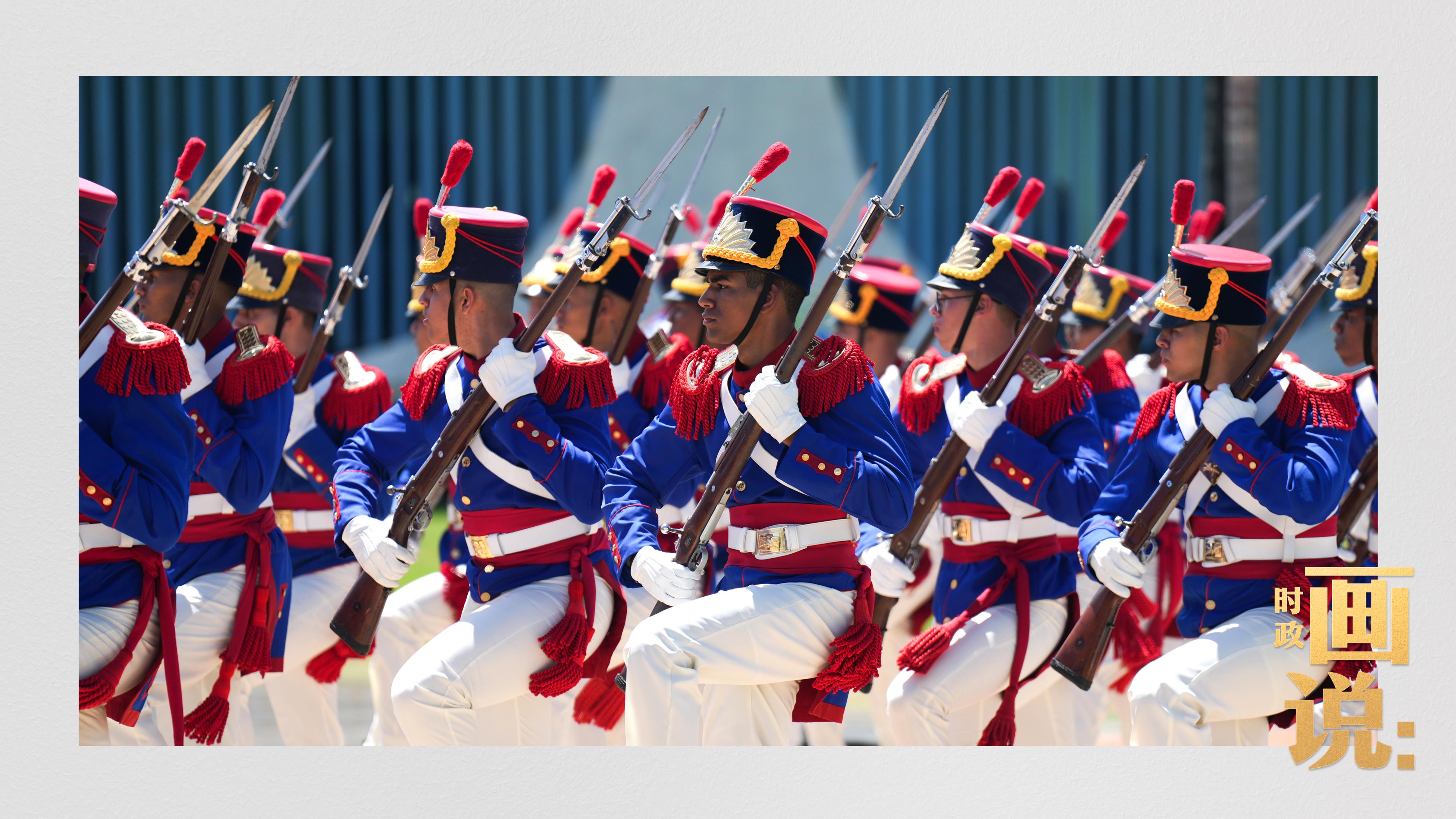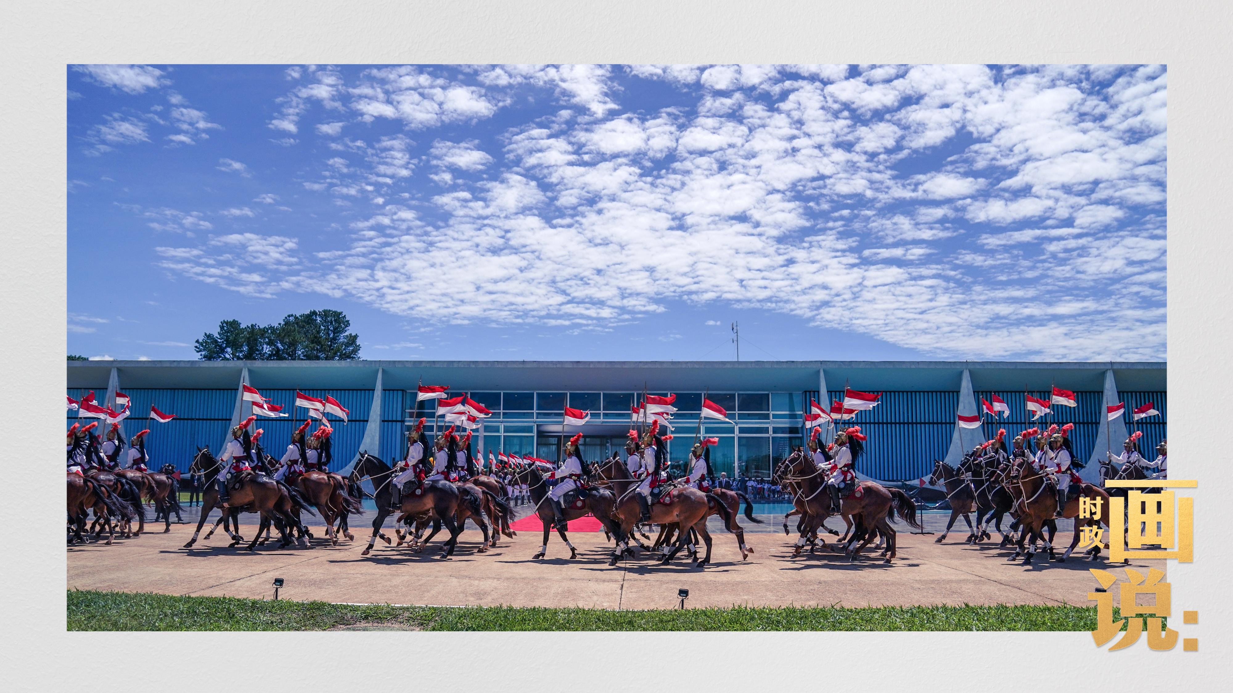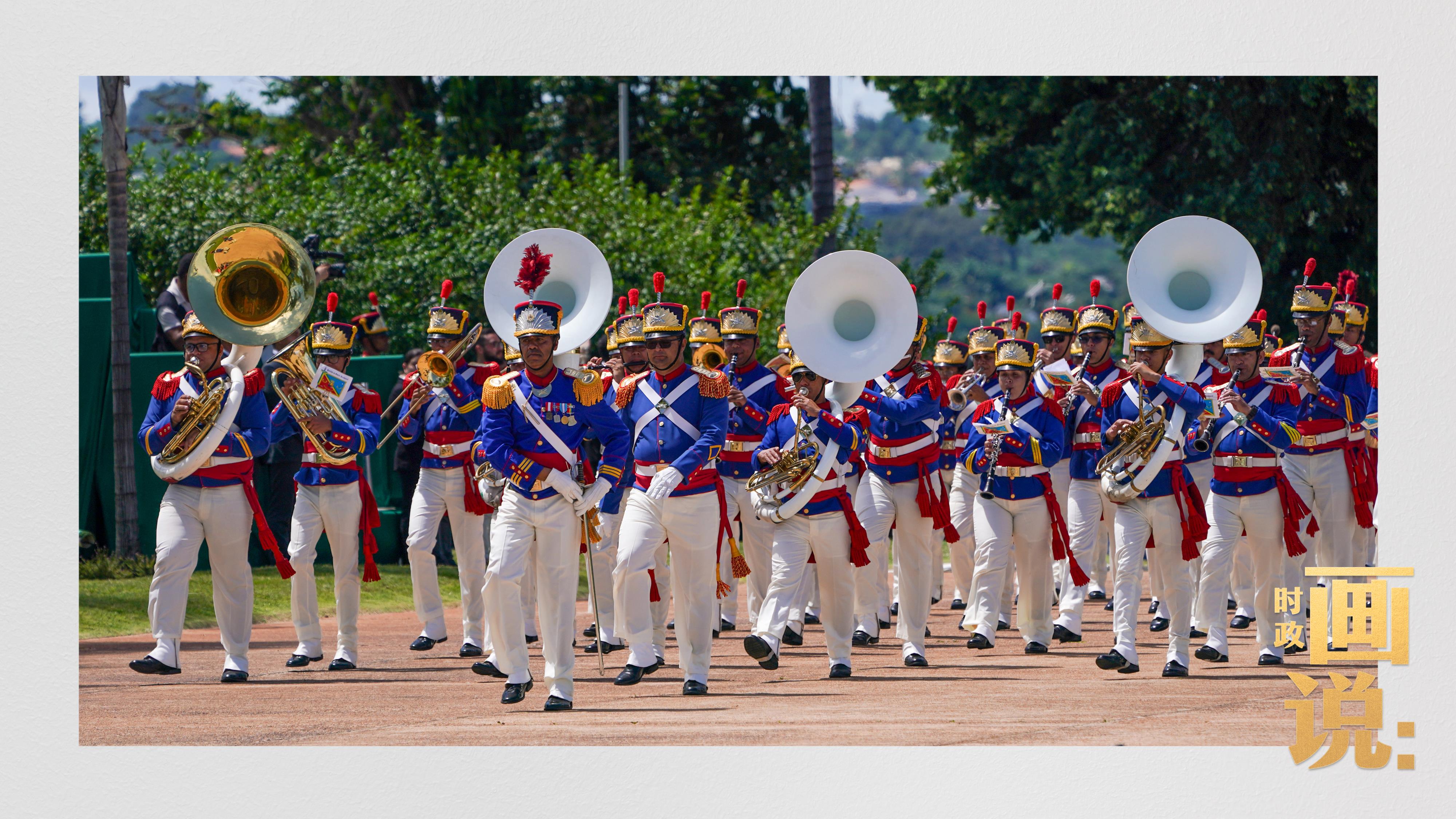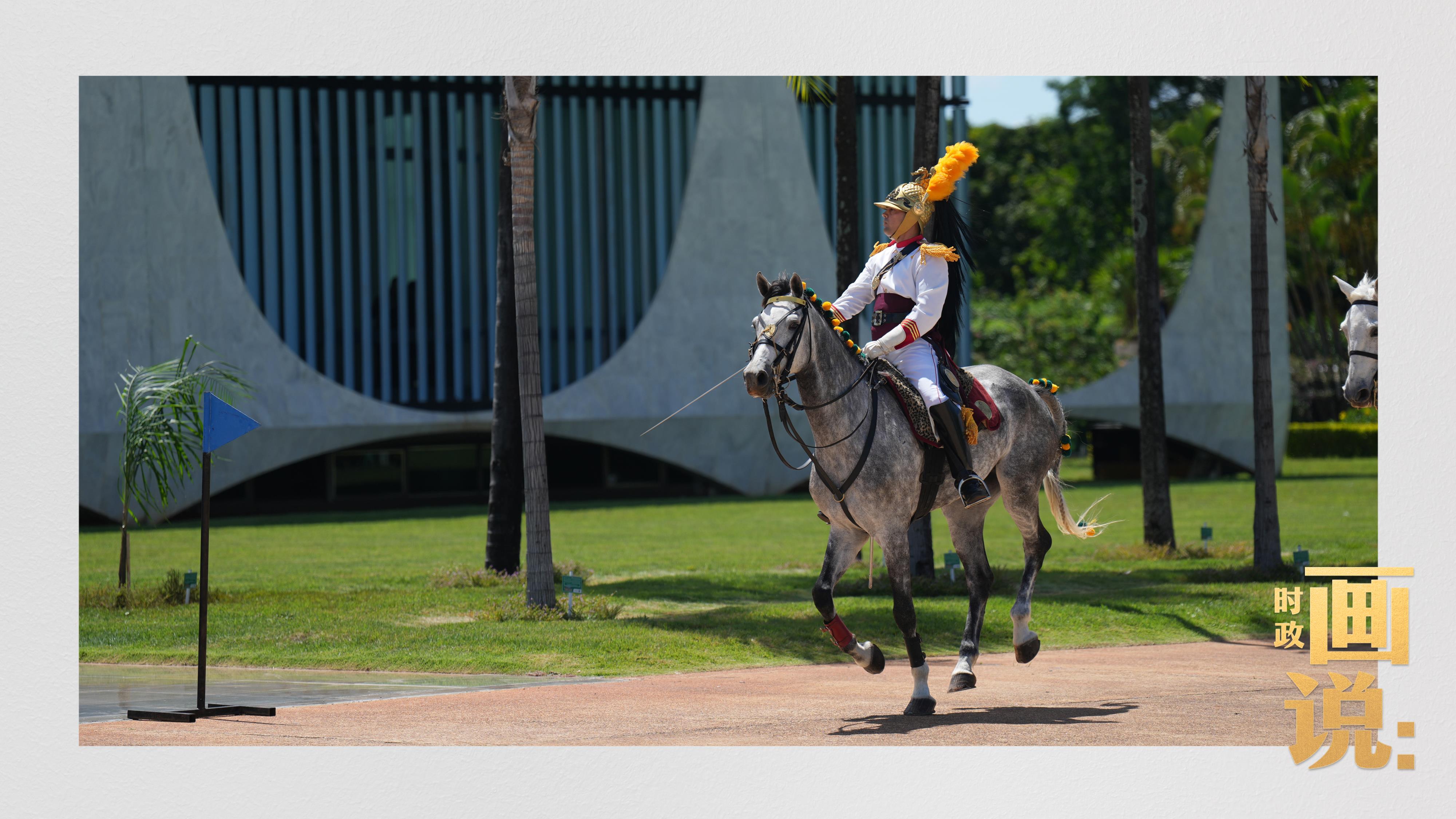 騎兵護衛(wèi)習近平主席專車抵達儀式現(xiàn)場,巴西藝術(shù)家用中文深情唱響中國經(jīng)典民歌《我的祖國》,現(xiàn)場氣氛隆重熱烈。
