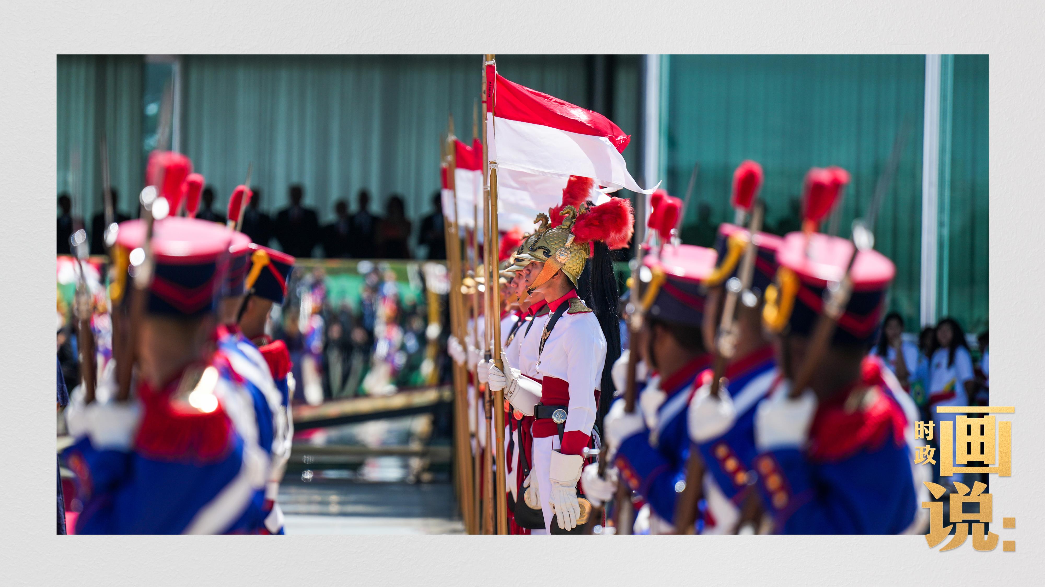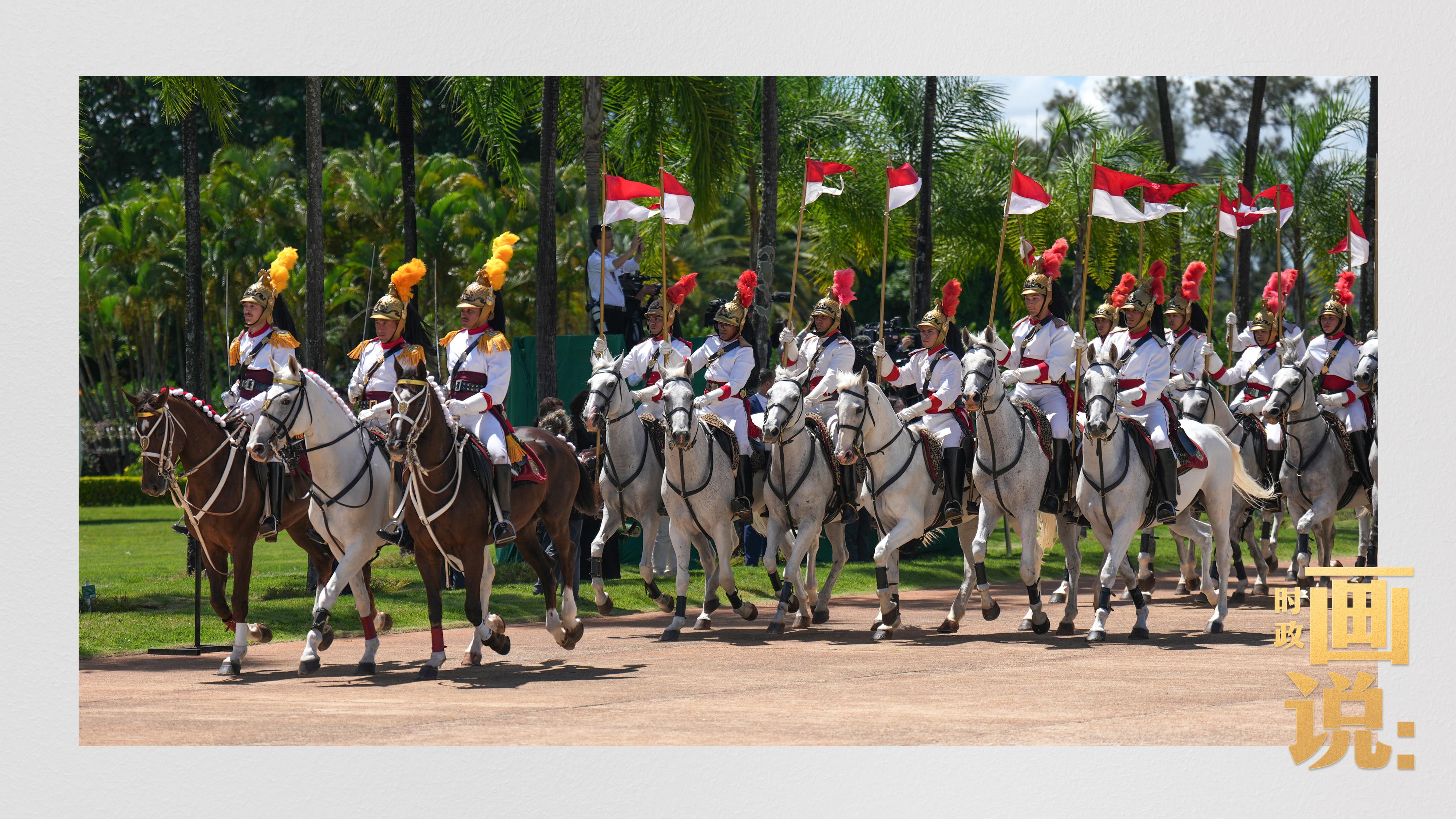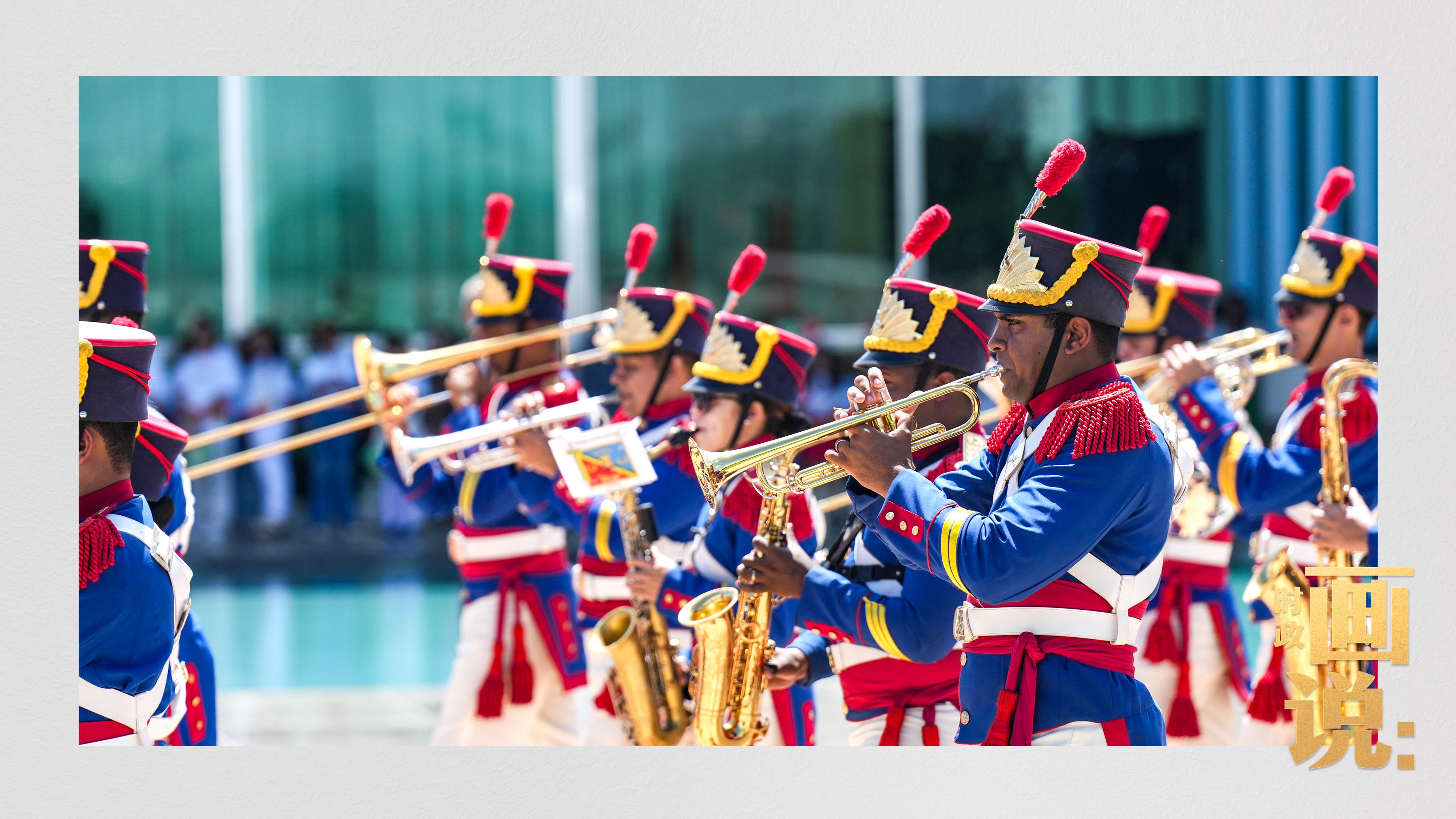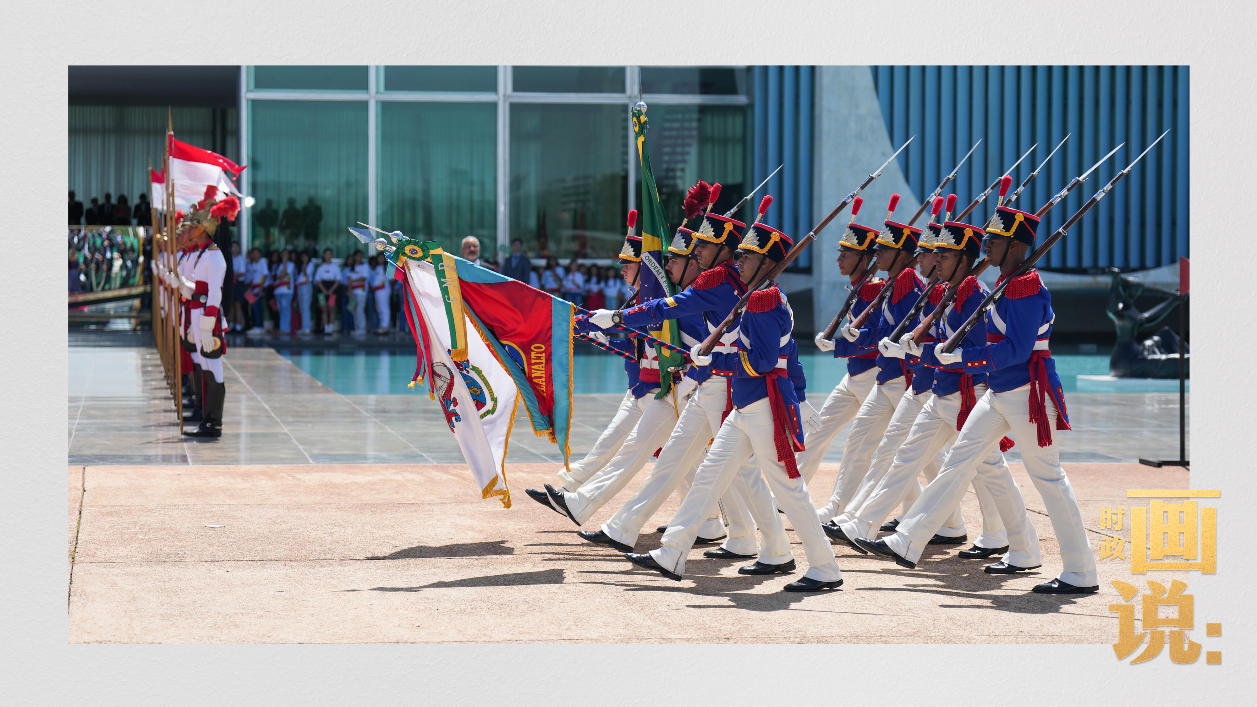 騎兵護衛(wèi)習近平主席專車抵達儀式現(xiàn)場,巴西藝術(shù)家用中文深情唱響中國經(jīng)典民歌《我的祖國》,現(xiàn)場氣氛隆重熱烈。