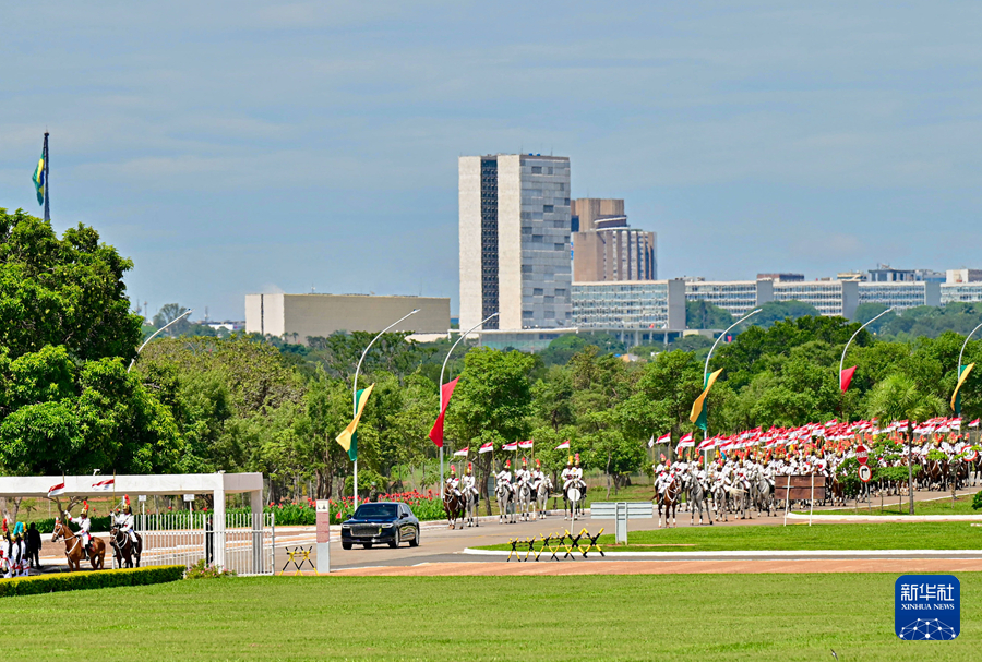 初夏時節(jié)的巴西利亞,天朗氣清。黎明宮內,綠草如茵,450名威武禮兵整齊列隊。在120名龍騎兵護衛(wèi)下,習近平乘車抵達黎明宮前廣場。