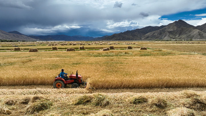 2024年9月10日在西藏日喀則市白朗縣巴扎鄉(xiāng)拍攝的秋收場景(無人機照片)。新華社記者 晉美多吉 攝