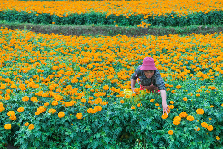 2024年7月30日,村民在貴州省威寧縣雙龍鎮(zhèn)高坡村采摘萬壽菊。新華社記者 楊文斌 攝