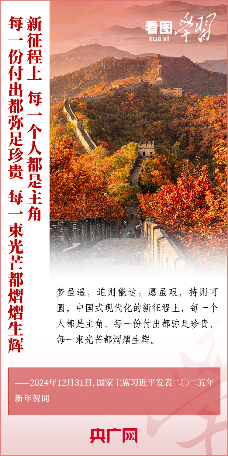 “夢雖遙,追則能達;愿雖艱,持則可圓?!毙履昵跋?,習近平主席發(fā)表二〇二五年新年賀詞。在溫暖有力的講述中,習主席深情回望過去一年中國不平凡的奮斗歷程、精彩瞬間,感慨大家一道經(jīng)歷的風雨彩虹、難忘時刻,贊美無數(shù)為夢想拼搏的勞動者、建設者、創(chuàng)業(yè)者。習主席說,中國式現(xiàn)代化的新征程上,每一個人都是主角,每一份付出都彌足珍貴,每一束光芒都熠熠生輝。讓我們充滿信心,在新的一年接續(xù)奮斗!