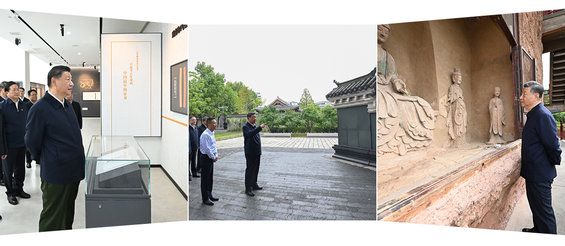 自左向右分別為:2024年11月4日,習(xí)近平總書記在湖北孝感云夢(mèng)縣博物館參觀出土秦漢簡(jiǎn)牘展;2024年10月17日,習(xí)近平總書記在安徽桐城六尺巷考察;2024年9月11日,習(xí)近平總書記在甘肅天水麥積山石窟考察。