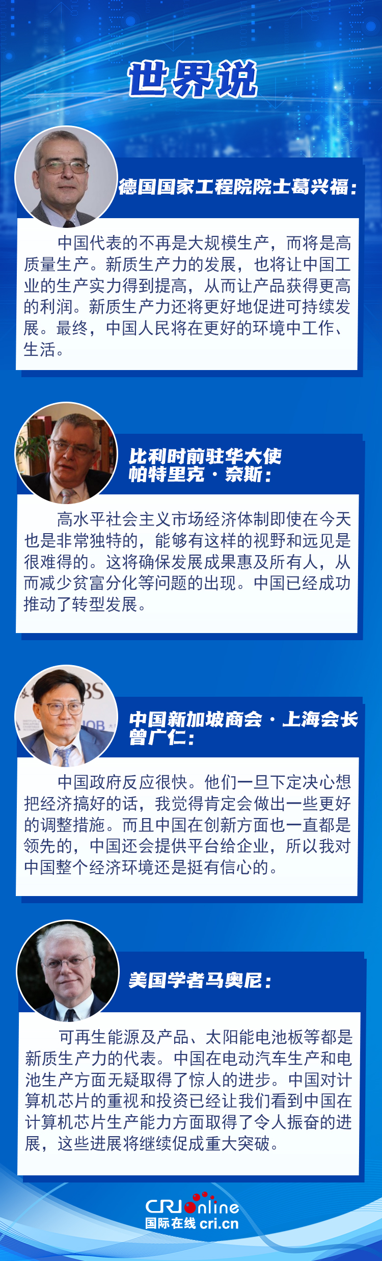 多位國際人士對中國經(jīng)濟(jì)發(fā)展充滿信心,高度肯定中國政府在經(jīng)濟(jì)發(fā)展中的核心引領(lǐng)作用,并對中國在高質(zhì)量生產(chǎn)及高精尖領(lǐng)域的創(chuàng)新領(lǐng)先地位表示贊賞。