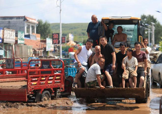 2024年8月21日,葫蘆島市建昌縣部分受災(zāi)居民乘鏟車(chē)轉(zhuǎn)移。