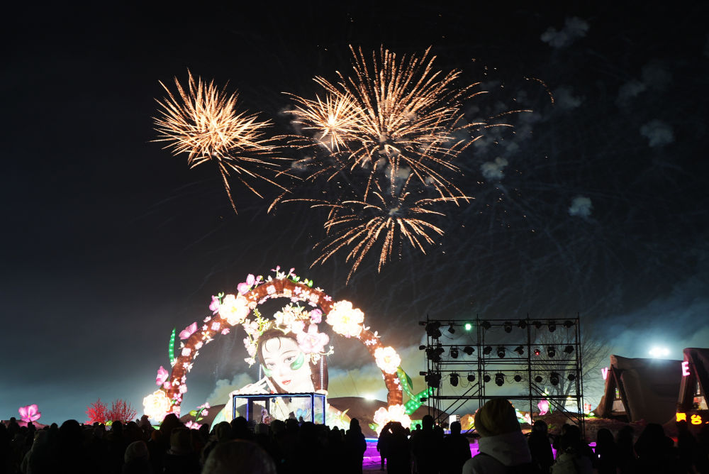 2025年1月12日,游客們在沈陽沈北新區(qū)稻夢小鎮(zhèn)觀看焰火表演。