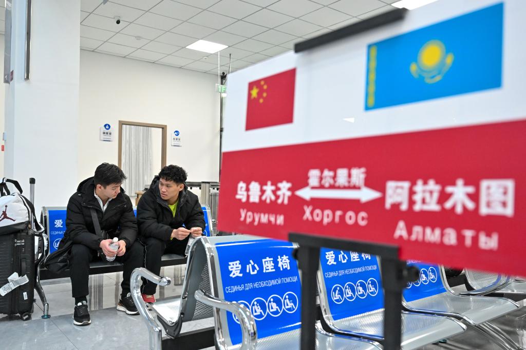 1月8日,在烏魯木齊陸港國際客運站,伊利亞索夫·安瓦爾(左)和同學(xué)在候車廳等候前往阿拉木圖的國際班車。新華社記者丁磊 攝