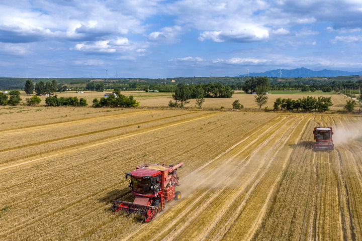 2024年6月5日,收割機在河南三門峽靈寶市的麥田里收獲小麥。新華社發(fā)(杜杰 攝)