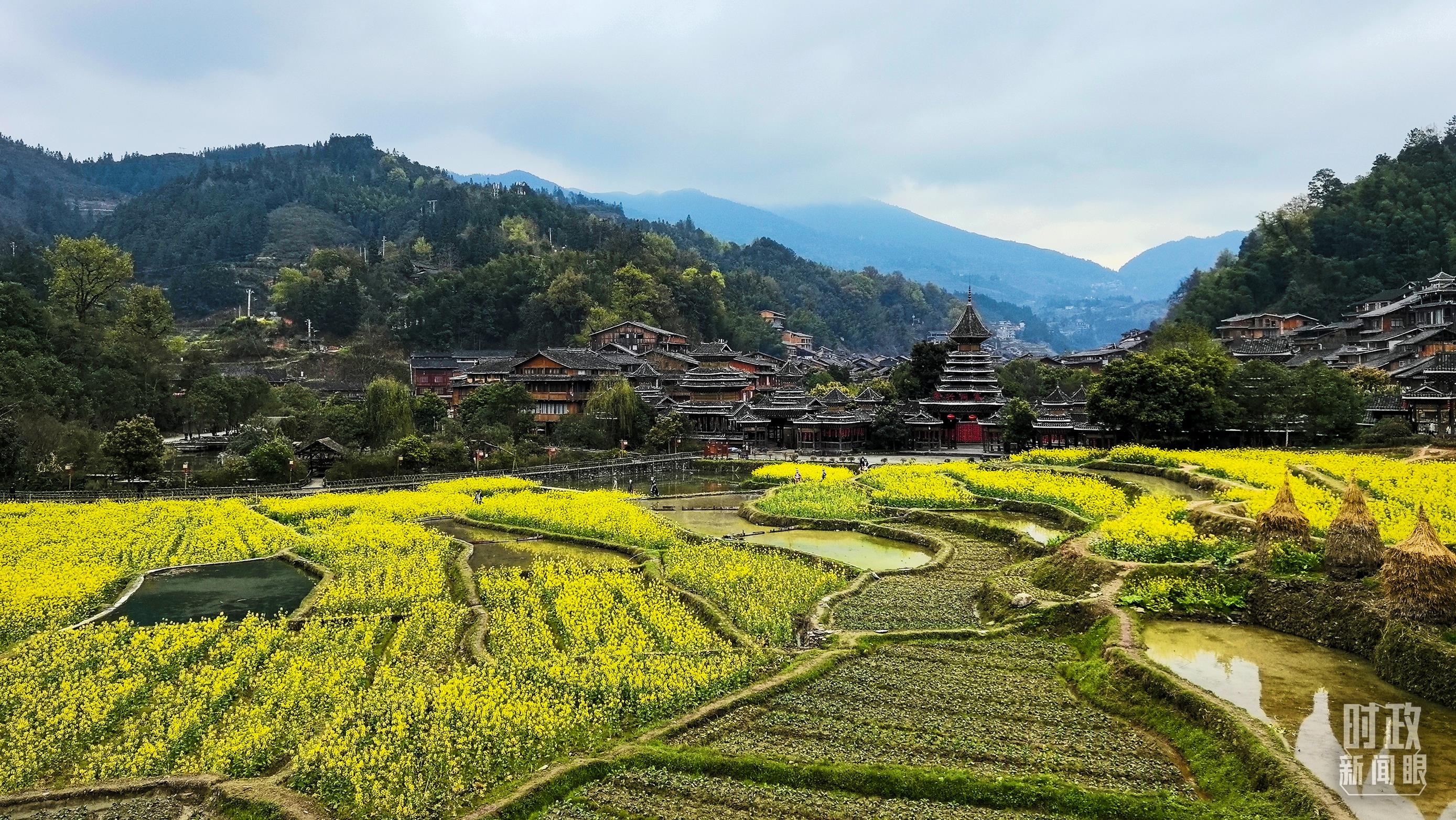 春日的肇興侗寨,油菜花競(jìng)相綻放。(總臺(tái)央視記者程鋮拍攝)