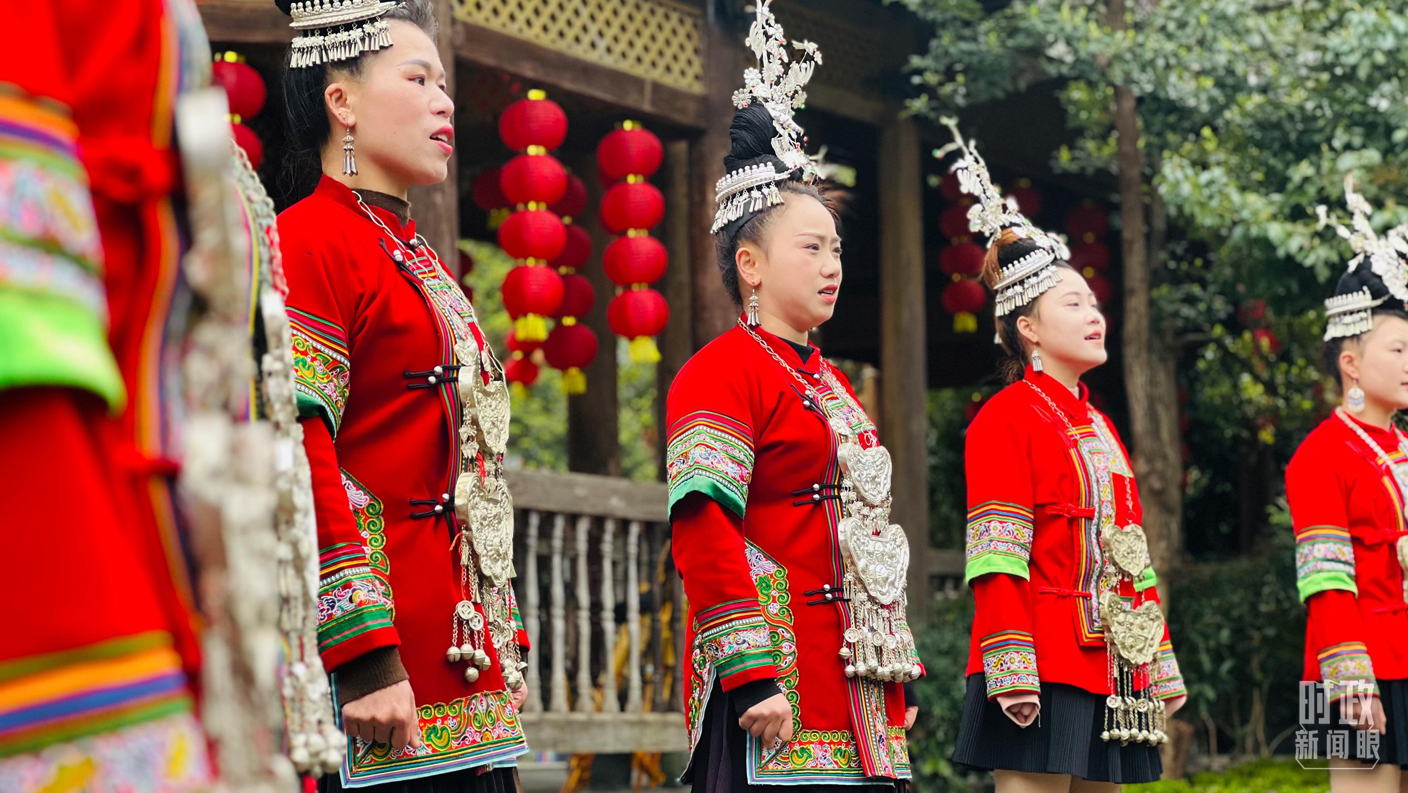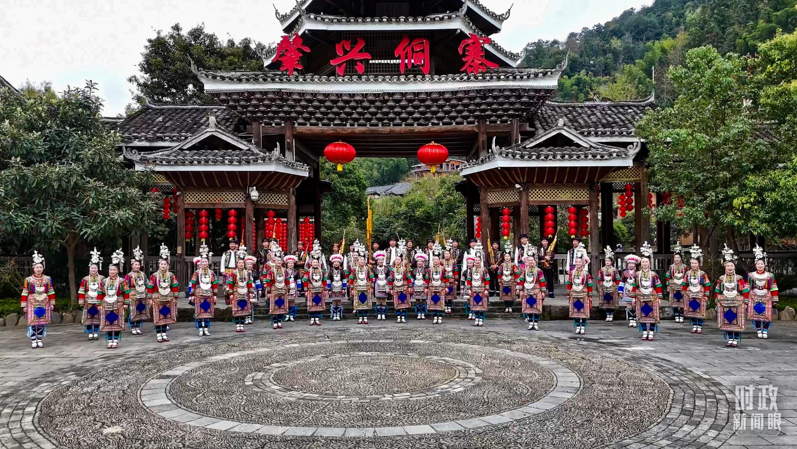 寨門處,鄉(xiāng)親們身著傳統(tǒng)服飾,唱起侗族大歌,歡迎遠(yuǎn)方的來(lái)客。(總臺(tái)央視記者范凱拍攝)