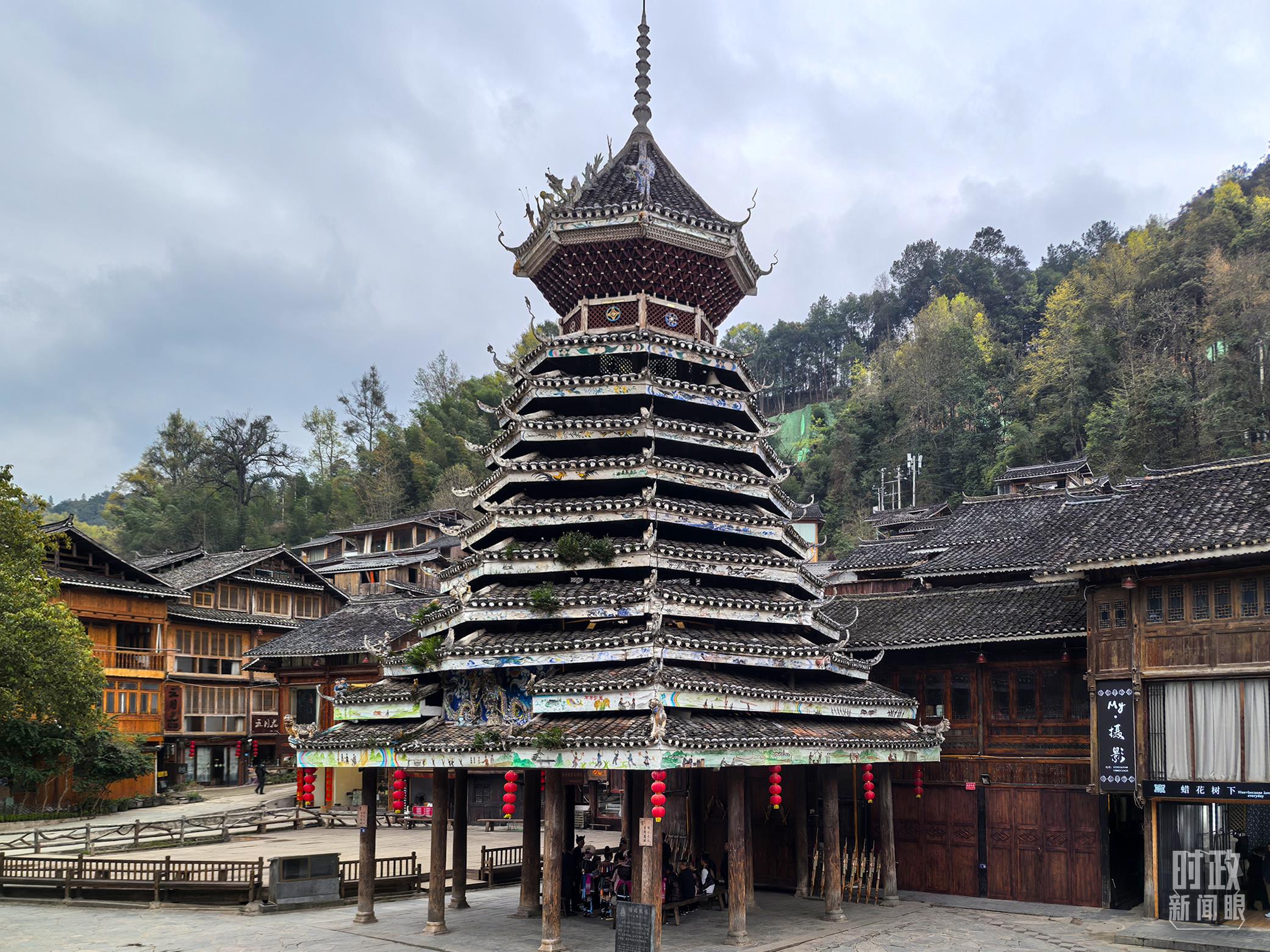 肇興侗寨以鼓樓群最為著名,五座鼓樓分別取名“仁團(tuán)鼓樓”“義團(tuán)鼓樓”“禮團(tuán)鼓樓”“智團(tuán)鼓樓”“信團(tuán)鼓樓”。圖中為信團(tuán)鼓樓。(總臺(tái)央視記者陸泓宇拍攝)