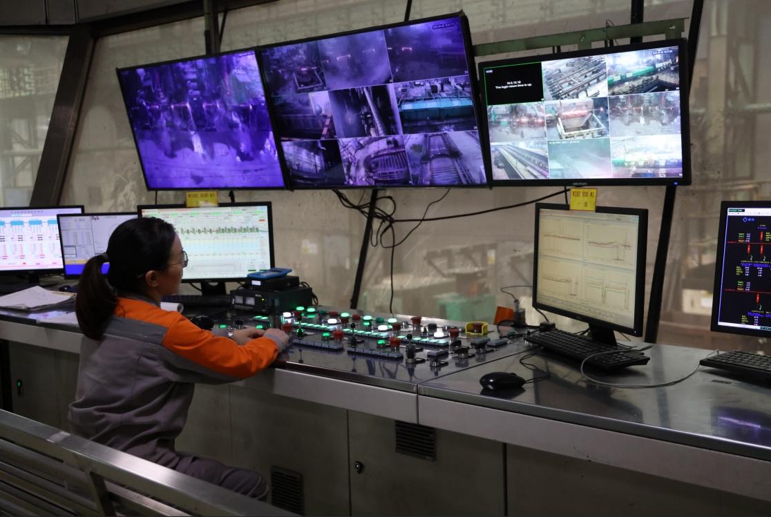 工作人員在馬中關(guān)丹產(chǎn)業(yè)園內(nèi)的聯(lián)合鋼鐵生產(chǎn)車間內(nèi)工作。(人民日?qǐng)?bào)記者楊一 攝)