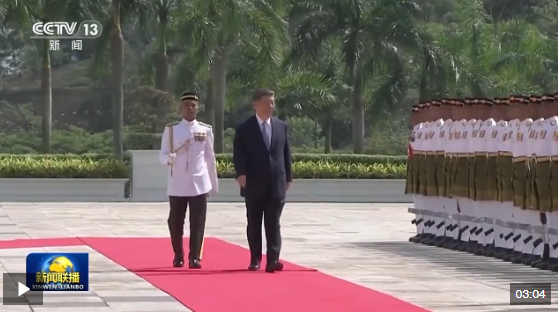 習(xí)近平乘車抵達(dá)時(shí),易卜拉欣和馬來西亞總理安瓦爾在下車處熱情迎接。兩國元首登上檢閱臺(tái),軍樂團(tuán)奏中馬兩國國歌,鳴禮炮21響。習(xí)近平檢閱儀仗隊(duì)。兩國元首進(jìn)入國家王宮大廳,同雙方陪同人員握手致意。