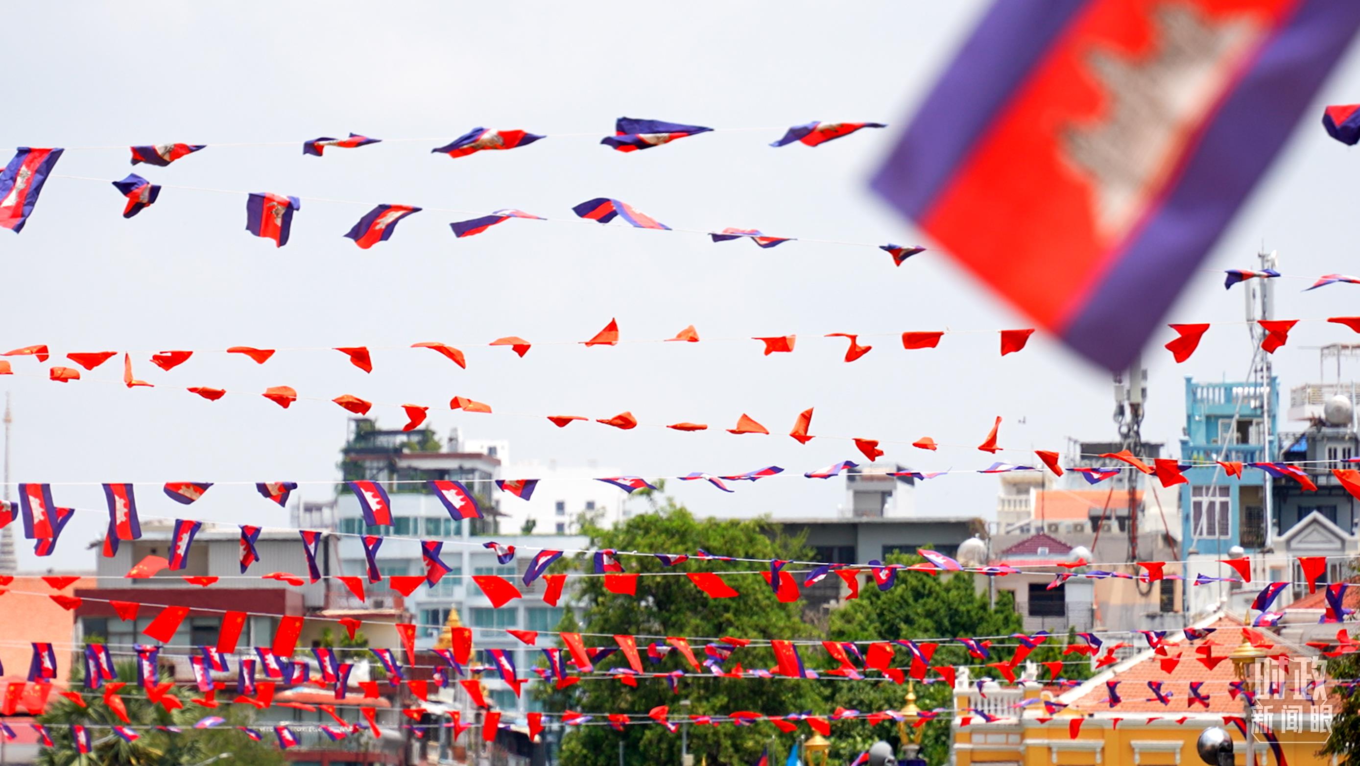 金邊街頭懸掛的中柬兩國國旗。(總臺(tái)央視記者盧心雨拍攝)