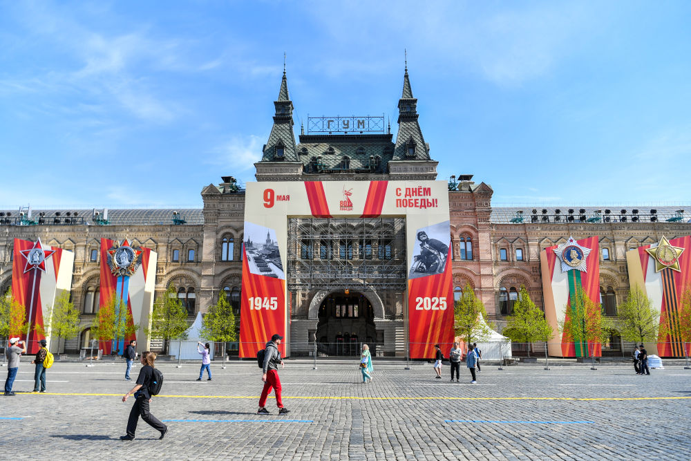 紀(jì)念蘇聯(lián)偉大衛(wèi)國戰(zhàn)爭勝利80周年慶典前夕,莫斯科街頭,寫有“勝利”字樣的旗幟隨風(fēng)飄揚(yáng)。在路邊,以蘇聯(lián)衛(wèi)國戰(zhàn)爭歷史為主題的圖片展板和裝飾櫥窗吸引行人停下腳步,或合影留念,或瀏覽沉思。