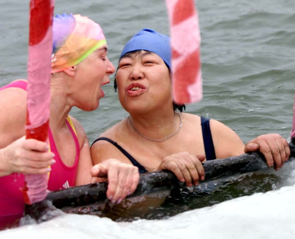 2002年1月15日,多次來華參加冬泳賽事的俄羅斯選手柳德米拉(左),在第二屆哈爾濱國(guó)際冬泳邀請(qǐng)賽上親吻老朋友、好姐妹——中國(guó)女隊(duì)員楊翠芬。