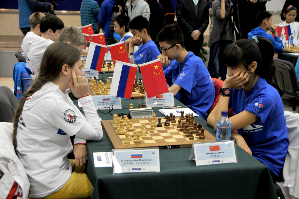 2014年11月7日,來自中國(guó)和俄羅斯的國(guó)際象棋青少年選手在“以棋會(huì)友”中俄國(guó)際象棋青少年友誼賽中對(duì)弈。