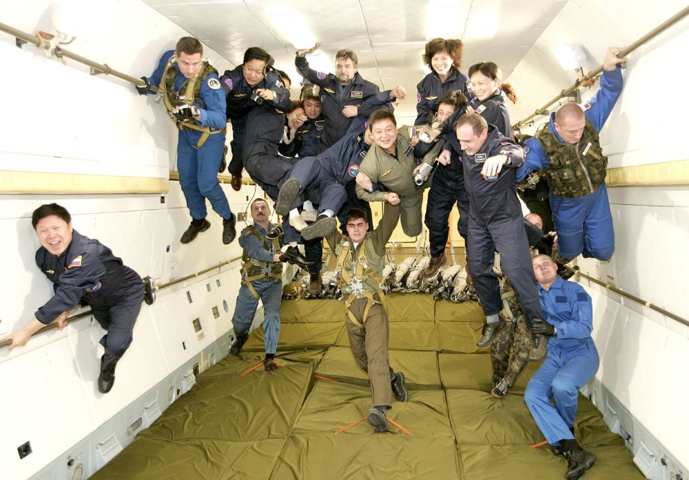 2004年12月17日,在俄羅斯首都莫斯科的加加林阿特拉斯宇航中心,10名中國(guó)游客在俄羅斯宇航員的保護(hù)下體驗(yàn)太空失重訓(xùn)練。