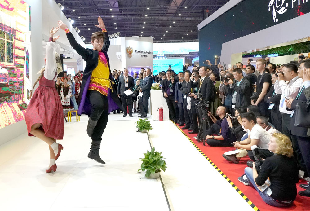 2018年11月6日,俄羅斯演員在上海舉行的首屆中國(guó)國(guó)際進(jìn)口博覽會(huì)俄羅斯展區(qū)表演舞蹈。