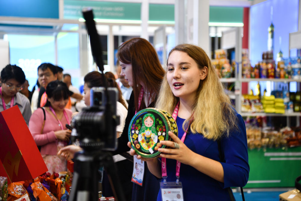2023年9月19日,來自俄羅斯的參展商在陜西楊凌農(nóng)高會(huì)展臺(tái)進(jìn)行直播。