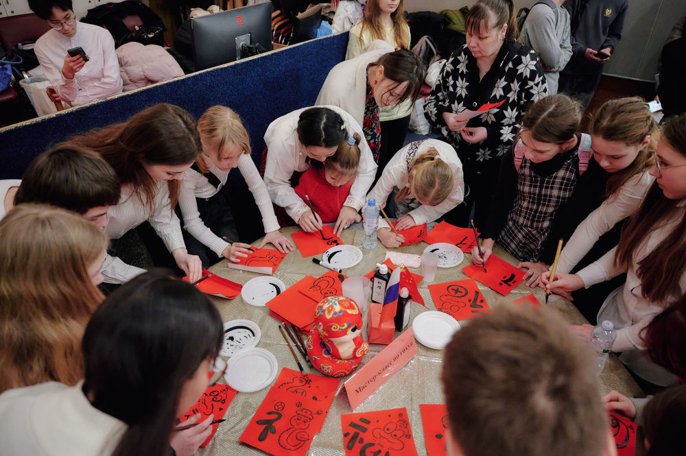 2025年2月3日,俄羅斯圣彼得堡學(xué)生在中小學(xué)春節(jié)聯(lián)歡節(jié)上體驗(yàn)中國(guó)書法。