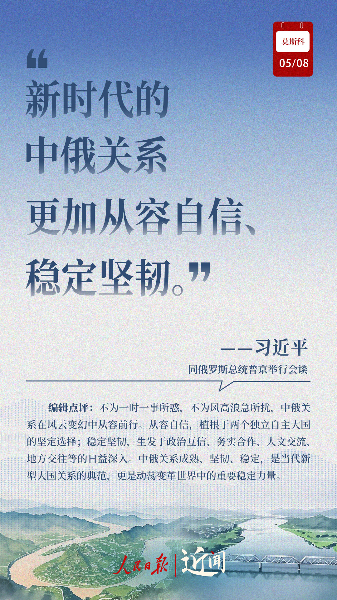 當(dāng)?shù)貢r(shí)間5月8日,習(xí)近平主席出席普京總統(tǒng)舉行的歡迎儀式、小范圍會(huì)談、大范圍會(huì)談、簽字和合作文本交換儀式、共見記者、茶敘,兩國(guó)元首不同形式的長(zhǎng)時(shí)間交流,引領(lǐng)中俄關(guān)系登高望遠(yuǎn)。